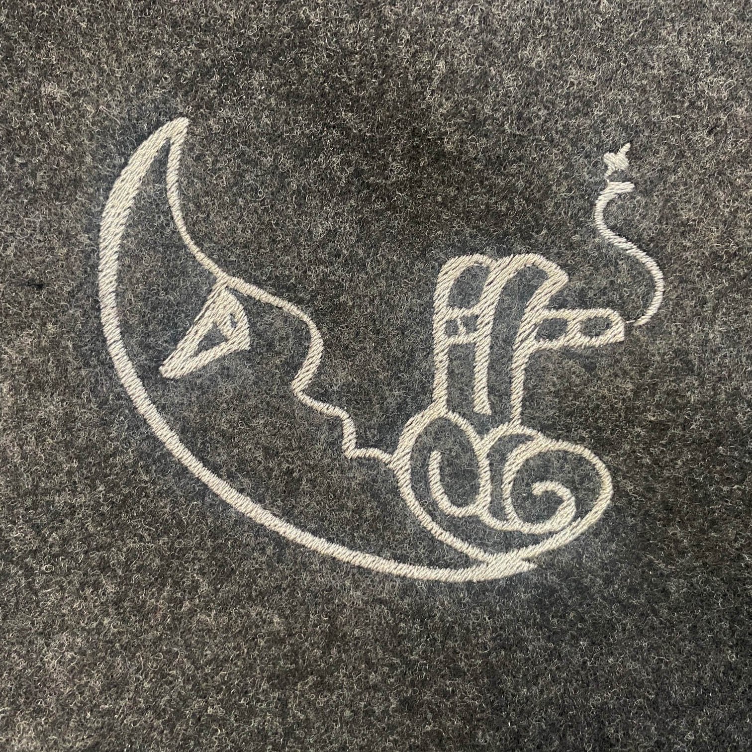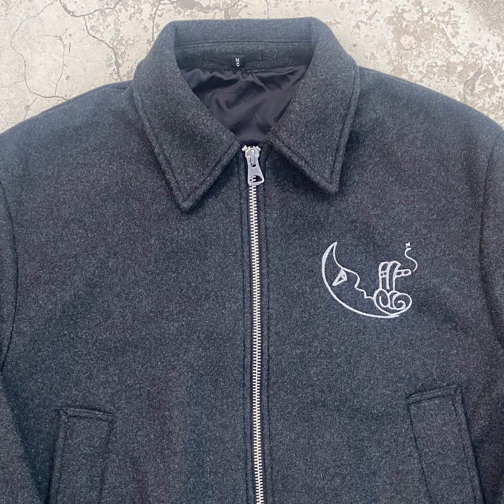 Featuring "Moon Man" An embroidered design by JG Marshall in silver grey positioned on the left front.